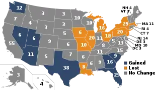 در مجموع ۸ ایالت (آریزونا، فلوریدا، جورجیا، نوادا، کالیفرنیا جنوبی، تگزاس، یوتا، واشینگتن) آرای الکترال را به موجب سرشماری نفوس سال ۲۰۱۰ کسب کردند. در همین حال ۱۰ ایالت (ایلینوی، آیوا، لویزیانا، ماساچوست، میشیگان، میسوری، نیوجرسی، نیویورک، اوهایو، پنسیلوانیا) رای از دست دادند.
