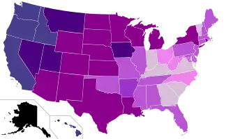 | نیوجرسی*[52] | ۱۴ | ۲٬۱۲۵٬۱۰۱ | ۵۸٬۳۸٪ | ۱٬۴۷۷٬۵۶۸ | ۴۰٬۵۹٪ | ۲۱٬۰۴۵ | ۰٬۵۸٪ | ۹٬۸۸۸ | ۰٬۲۷٪ | ۶٬۶۹۰ | ۰٬۱۸٪ | ۶۴۸٬۲۲۸ | ۱۷٬۷۹٪ | ۳٬۶۴۰٬۲۹۲ |