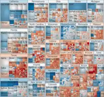 Treemap از آرای مناطق، ایالات، غلبه نامزد در هر محل.