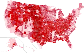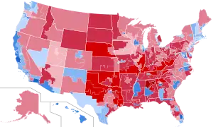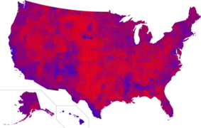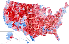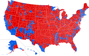 نتایج براساس شهرستان. قرمز برای ترامپ، آبی برای کلینتون