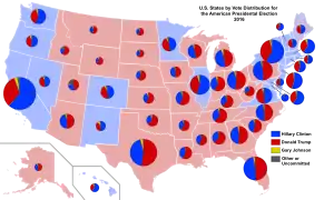 نتایج بر اساس آرای مردمی در هر ایالت. نمودار دایرهای هر ایالت متناسب با تعداد رای الکترال آن ایالت میباشد.