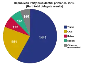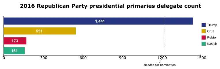 سناتور ایالات متحده تد کروز از تگزاس نخستین نامزد اصلیای بود که حضور خود در انتخابات ۲۰۱۶ را در تاریخ ۲۳ مارس ۲۰۱۵ اعلام کرد.[7][8] سناتور کنتاکی، رند پال دومین نامزدی بود که در ۷ آوریل ۲۰۱۵ نامزدی خود را اعلام کرد.[9] مارکو روبیو، سناتور فلوریدا، نامزد بعدی بود که در ۱۳ آوریل اعلام نامزدی کرد.[10][11] کارلی فیورینا نامزدی خود را در ۴ مه ۲۰۱۵ اعلام کرد.[12] مایک هاکبی، نامزد انتخابات سال ۲۰۰۸ و فرماندار سابق آرکانزاس، نامزدی خود را یک روز بعد اعلام کرد.[13] سناتور سابق پنسیلوانیا و نامزد انتخابات ۲۰۱۲، ریک سنتوروم، مبارزه خود را در ۲۷ مه اعلام کرد.[14] جرج پتکی، از فرمانداران سابق ایالت نیویورک نامزد بعدی بود که در ۲۸ مه، ۲۰۱۵ وارد رقابتها شد.[15] لیندسی گراهام، سناتور کارولینای جنوبی، در ۱ ژوئن اعلام نامزدی کرد.[16] فرماندار سابق تگزاس، ریک پری، که در سال ۲۰۱۲ هم نامزد شده بود، در ۴ ژوئن اعلام کرد دوباره رقابت خواهد کرد.[17] فرماندار سابق فلوریدا، جب بوش، در ۱۵ ژوئن به رقابتها وارد شد.[18] دونالد ترامپ، ساختمان ساز و مجری سابق ریلتی شوهای تلویزیونی در ۱۶ ژوئن اعلام نامزدی کرد.[19] بابی جیندال، فرماندار وقت لوئیزیانا، در ۲۴ ژوئن اعلام نامزدی کرد.[20] کریس کریستی فرماندار نیو جرسی در ۳۰ ژوئن اعلام نامزدی کرد.[21] فرماندار ویسکانسین اسکات واکر در ۱۳ ژوئیه اعلام نامزدی کرد.[22] فرماندار اوهایو جان کیسک در ۲۱ ژوئیه اعلام نامزدی کرد.[23] فرماندار سابق ویرجینیا جیم گیلمور آخرین نامزد بود که در ۳۱ ژوئیه اعلام نامزدی کرد.[24] ریک پری، در ۱۱ سپتامبر ۲۰۱۵ از رقابتها کناره گرفت. اسکات واکر در ۲۱ سپتامبر کنار کشید. بابی جیندال در ۱۷ نوامبر نامزدی خود را خاتمه داد. لیندسی گراهام در ۲۱ دسامبر کنارهگیری کرد. جرج پتکی در ۲۹ دسامبر کنارهگیری کرد. مایک هاکبی در ۱ فوریه کناره گرفت. ریک سنتوروم و رند پال در ۳ فوریه کنارهگیری کردند. تد کروز انتخابات انجمنهای حزبی آیووا را در ۱ فوریه برد و دونالد ترامپ و مارکو روبیو به ترتیب دوم و سوم شدند. ترامپ بقیهٔ رقابتهای ماه فوریه را برنده شد: نیوهمپشر، کارولینای جنوبی و نوادا. کریس کریستی و کارلی فیورینا پس از ناکامی در کسب آرای بالا در رقابتهای آیووا و نیوهمپشر در ۱۰ فوریه از رقابتها کناره گرفتند. جیم گیلمور در ۱۲ فوریه کناره گرفت. .[25] جب بوش در ۲۰ فوریه پس از کسب آرای کم در آیووا و نیو همپشر کنارهگیری کرد. در ۱ مارس، ۱۱ ایالت رقابتهای خود را در چارچوب «سهشنبه بزرگ» برگزار کردند. سناتور کروز اکلاهما، آلاسکا و ایالت خود، تگزاس، را برنده شد. سناتور روبیو نخستین ایالت خود را (مینه سوتا) برنده شد. دونالد ترامپ توانست در آلاباما، آرکانزاس، جورجیا، ماساچوست، تنسی، ویرجینا و ورمانت در جایگاه اول قرار گرفته و تا انتهای آن شب ۲۳۷ دلگت به دست آورد و جایگاه خود را به عنوان پیشتاز کسب نامزدی حزب جمهوریخواه تحکیم ورزد. بن کارسون کمپین خود را در ۴ مارس به تعلیق درآورد و چند روز بعد از ترامپ حمایت کرد.[26][27] در ۶ مارس، کروز در مین و کانزاس برنده شد و ترامپ در لوئیزیانا و کنتاکی پیروز شد. روبیو پورتوریکو را در ۶ مارس برد. در ۸ مارس ترامپ میشیگان، میسیسیپی و هاوایی و کروز آیداهو را برنده شدند. مارکو روبیو پس از شکست در ایالت خود، فلوریدا در ۱۵ مارس، کمپین خود را به حال تعلیق درآورد. در این روز جان کیسیک در اهایو و ترامپ در ایلینوی، فلوریدا، میزوری، کارولینای شمالی و جزایر ماریانای شمالی پیروز شدند. در ۲۲ مارس کروز در یوتا و ترامپ در آریزونا پیروز شدند.