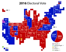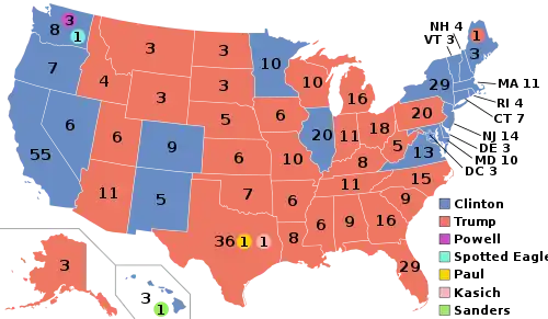 - در نتایج نهایی ایالات، ترامپ ۳۰۶ و کلینتون ۲۳۲ الکتور مقید به دست آوردند. آنان به ترتیب ۲ و ۵ رأی را به گزیننده بیاعتقاد باختند. پنس و کین به ترتیب یک و پنج رأی از دست دادند.