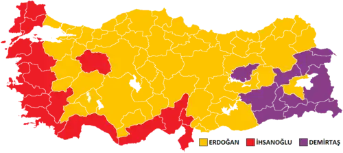 | نتیجهٔ انتخابات بر پایهٔ نامزد پیروز به تفکیک استان اردوغان احساناوغلو دمیرتاش | |||||||||||||||||||||||