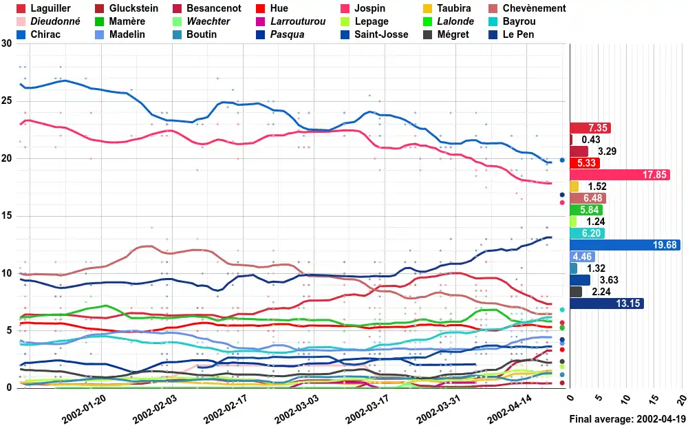 | ژان-ماری لو پن | جبهه ملی | FN | ۴٬۸۰۴٬۷۱۳ | ۱۶٫۸۶٪ | ۵٬۵۲۵٬۰۳۲ | ۱۷٫۷۹٪ | |
