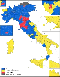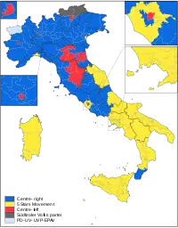 | راست: نتایج مربوط به مجلس نمایندگان، چپ: نتایج مربوط به سنا آبی: ائتلاف راست میانه زرد: جنبش پنجستاره سرخ: ائتلافهای چپ میانه آبی کمرنگ: ائتلاف محلی آئوستا ولی خاکستری: ائتلاف محلی تیرول جنوبی | |||||||||||||||||||||||||||||||||||||||||||||||||||||||||||