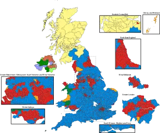 نظرسنجیها حاکی از آن بودند که نتیجهٔ انتخابات بسیار نزدیک خواهد بود و همچون انتخابات ۲۰۱۰ یک پارلمان معلق شکل خواهد گرفت. اما پس از مشخص شدن نتایج معلوم شد که نظرسنجیها، رأی محافظهکاران را دستکم گرفته بودند چون آنان در کمال تعجب، اکثریت ساده کرسیهای پارلمان را کسب کردند. نتیجهٔ انتخابات مشابه انتخابات سراسری ۱۹۹۲ بود. محافظهکاران که در ائتلاف با لیبرالدموکراتها از ۲۰۱۰ در قدرت بودند، ۳۳۰ کرسی و ۳۶٫۹ درصد آراء مردمی را کسب کردند و حائز اکثریتی به اندازهٔ ۱۲ کرسی شدند.
