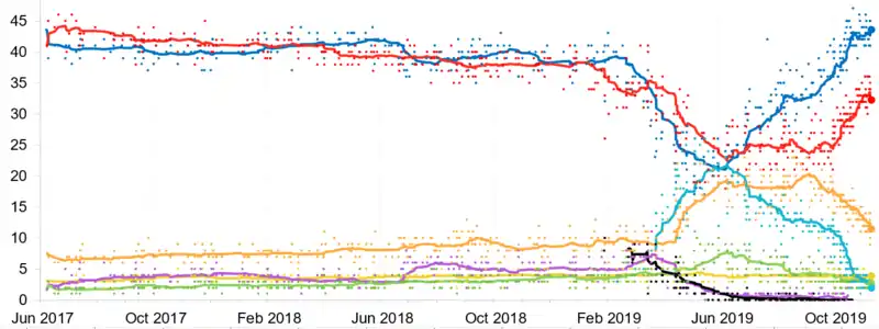 نمودار زیر نتایج نظرسنجیهایی که بیشتر در بریتانیای کبیر انجام شدهاند را نشان میدهد. بازهی زمانی این نظرسنجی از ابتدای ۲۰۱۷ تا کنون است. وضعیت هر خط در هر نقطه نشاندهندهٔ نتایج ۱۵ نظرسنجی اخیر است.