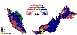 نتایج اولیه کمیسیون انتخابات مالزی نشان میدهد ائتلاف اپوزیسیون پاکاتان هاراپان که در بیشتر مالزی تحت لوای یکی از احزاب تشکیل دهنده اش به نام حزب عدالت خلق رقابت میکند با ۱۱۳ کرسی اکثریت را در دوان راکیات یا مجلس سفلای پارلمان را کسب کردهاست. علاوه بر این دو نامزد مستقل و حزب میراث صباح نیز که بهطور غیررسمی با آن هم پیمانند نیز ۱۰ کرسی دیگر را به دست آوردند که به آن با ۱۲۳ کرسی امکان تشکیل دولت را میدهد.[1][2]