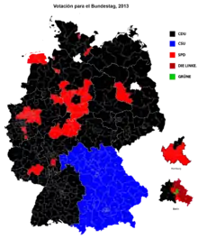 | رنگ آبی مناطقی را نشان میدهد که اتحادیه دموکرات مسیحی به اکثریت رسید و رنگ صورتی مناطقی را نشان میدهد که حزب سوسیال دموکرات به اکثریت رسید. | ||||||||||||||||||||||||||||||||||||||||||||||||||||||||||||||||||||||||||||||||||||||||||||||||||||||