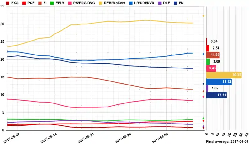 در این انتخابات، حزب ان مارش! به رهبری امانوئل مکرون با ائتلاف با حزب جنبش دموکراتیک به رهبری فرانسوا بایرو، توانستند در مجموع ۳۵۰ کرسی را بدست آورده و در نتیجه به حزب اکثریت در مجمع ملی فرانسه تبدیل شدند. از سوی دیگر، حزب جمهوریخواهان فرانسه و متحدان آن در این انتخابات توانستند با کسب ۱۳۶ کرسی، جایگاه خود را به عنوان حزب شماره دو در مجمع ملی فرانسه همچنان تثبیت کنند. ولی سوسیالیستها که در مجلس قبل، حزب نخست بودند، در این انتخابات شکست سنگینی خوردند و فقط توانستند ۴۵ کرسی را تصاحب کنند. حزب جدیدالتأسیس جنبش فرانسه تسلیمنشدنی به رهبری ژان-لوک ملانشن نیز با تصاحب ۱۷ کرسی توانست جایگاه چهارم را در این انتخابات از آن خود سازد. [1]