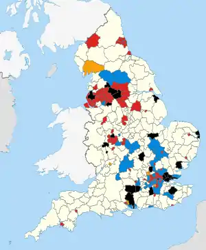 | Map showing results of UK local elections, 2014. Areas in white will not hold an election, those in grey are not part of England. حزب لیبرال دموکرات No overall control | |||||||||||||||||||||||||||||||||||||||||||||||||||||||