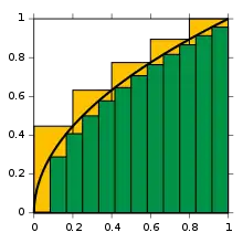 محاسبه سطح زیر نمودار بهوسیله مستطیلهایی زیر نمودار. هر چه قدر عرض مستطیلها کوچک میشوند مقدار دقیق تری از مقدار انتگرال بدست میآید.