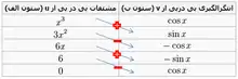حال به سادگی نخستین خانه ستون الف را در دومین خانه ستون ب، دومین خانه ستون الف را در سومین خانه ستون ب، و… ضرب کرده، و سپس علامت این جملهها را با شروع از اولی مثبت، منفی، مثبت، منفی و همینطور یکی در میان قرار دهید. توجه شود که علامت جمله اول +، دوم - و… است. در شکل زیر نحوه کار را میبینید: