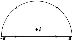 که روی i و −i نقطهٔ تکین دارد. با این حال، ما میخواهیم یک مسیر انتخاب کنیم که انتگرال حقیقی مقدار را احاطه کند، بنا بر این یک نیم دایره مانند شکل بالا انتخاب میکنیم، و آن را گسترش میدهیم تا تمام محور حقیقی را در بر بگیرد (a به سمت بینهایت میل میکند). این مسیر را C مینامیم.