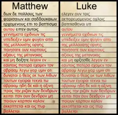 انجیل مرقس، متی و لوقا (انجیلهای همنظر) شامل شمار بسیار زیادی از داستانهای مشابه، اغلب با ترتیب یکسان و حتی با کلمات عیناً یکسان. ارتباط انجیل متی با انجیل مرقس و لوقا سؤال حل نشده یی پیش روی محققین بوده و معمولاً با عنوان «مسئله انجیلهای هم نظر» از آن یاد میشود. میزان برهم پوشانی ساختار جملات و انتخاب کلمات سه انجیل معمولاً اینگونه توضیح داده میشود که نویسندههای انجیلها یا یکی از روی دیگری متن را کپی کرده یا هر دو از یک منبع مشترک کپی کردهاند. امروزه کمابیش همه پژوهندگان از سراسر دنیا روی این به توافق رسیدهاند که انجیل متی (و لوقا) از انجیل مرقس، به علاوه یک متن فرضی دیگر بنام Q که شامل سخنان عیسی است، استفاده کردهاند. گروه اقلیت بر این نظر هستند که متی اول بود، لوقا متن متی را گسترش داد و مرقس متن لوقا و متی را مخلوط کردهاست. برای گروه اکثریت، متن Q توضیح دهنده آنچه متی و لوقا با هم در اشتراک دارند - بعضی وقتها حتی کلمه به کلمه یکسان- ولی در انجیل مرقس وجود ندارد. مثلاً سه وسوسه عیسی توسط شیطان، دعا عیسی، و خیلی از گفتههای پراکنده عیسی.[5][17][18] متی شامل ۶۱۲ آیه از کل ۶۶۲ آیه مرقس است، و با غیر از چند استثناء همه در ترتیب یکسانی هستند.[19] ولی متی به صورت مکرر متن مرقس را از نظر نگرشی بهبود میبخشد. متی جملات تکراری مرقس، کلامات غیر معمول، را حذف کرده و آن جملاتی که ممکن است عیسی را به شکل بدی نشان دهد حذف میکند (مثلاً حذف «عیسی عقل از سرش پریده بود» در مرقس ۳:۲۱، و «آیا تو اهمیت نمیدهی» در مرقس ۴:۳۸ و غیره).[20]
