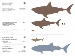 نمودار مقایسه اندازه یک غواص با قد متوسط با اندازه کوسه سفید بزرگ، کوسه نهنگ و مگالودون. در وسط تصویر یک اندازه گیری خطی به متر وجود دارد.