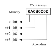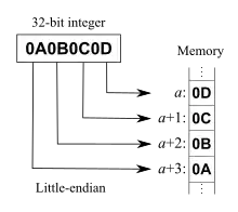 هر بایت از حافظه آدرس منحصر به فرد خود را داراست و محتوای یک متغیر n بایتی، یک خانه ی n بایتی را از حافظه را اشغال میکند. یک رایانه بیگ اندین بایت پرارزش متغیر را در ابتداییترین خانه حافظه ذخیره میکند، در حالیکه یک رایانه لیتل اندین کم ارزشترین بایت متغیر را در ابتداییترین خانه حافظه ذخیره مینماید. چنانچه در شکلهای روبرو می بینیم اگر داده خود را 0A0B0C0Dh در نظر بگیریم در سیستمهای بیگ اندین 0Ah در اولین خانه حافظه دخیره میشود در حالیکه در سیستمهای لیتل اندین در آخرین فضای حافظه جای گرفتهاست. برای داده 0000111111110000b نیز به همین ترتیب، ۸ بیت پر ارزش، یعنی 00001111b در سیستم بیگ اندین در ابتداییترین خانه حافظه و در سیستم لیتل اندین در آخرین خانه حافظه میگیرد.