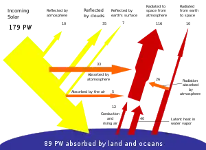 تابش خورشید توسط سطح زمین، اقیانوسها - که حدود ۷۱٪ کره زمین را پوشش میدهد - و جو جذب میشود. هوای گرم حاوی آب تبخیر شده از اقیانوسها بالا رفته و باعث گردش جوی یا همرفت میشود. هنگامی که هوا به ارتفاع زیادی میرسد، جایی که دما کم است، بخار آب تبدیل به ابرهایی متراکم میشود، که بر روی سطح زمین به شکل باران فرود میآید و چرخه آب را کامل میکند. گرمای نهانِ چگالش آب با افزایش همرفت، پدیدههای جوی مانند باد، سایکلونها و آنتی سایکلونها را تولید میکند.[8] نور خورشید جذب شده توسط اقیانوسها و خشکیها، دمای سطح را در دمای متوسط ۱۴ درجه سلسیوس نگه میدارد.[9] گیاهان سبز با استفاده از فتوسنتز، انرژی خورشیدی را به انرژی ذخیره شده شیمیایی تبدیل میکنند که باعث تولید غذا، چوب و زیست تودهای میشود که از آن سوختهای فسیلی حاصل میشود.[10]