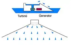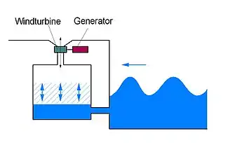 ستونی از آب در یک لوله بدون کف یا جعبه شناور روی سطح دریا بالا و پائین میرود و این حرکت تولید جریانی از هوا با سرعت زیاد میکند که میتواند توربین را به حرکت درآورد. آب بالا رونده در یک استوانه، هوای فشرده را از درون یک توربین عبور میدهد. سپس در بازگشت، هوا را در جهت مخالف فشرده و از توربین دیگری عبور میدهد.