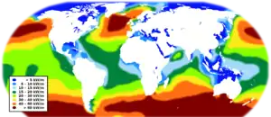 انرژی امواج به صورت غیر یکنواخت در سطح جهان گسترده شده اند. نقشه رو به رو تمرکز این انرژی را در نیمکره شمالی و جنوبی بین عرض جغرافیایی 30 تا 60 درجه نشان می دهد. سواحل غربی اروپا، سواحل کانادا و آمریکا، و سواحل جنوب غربی استرالیا، نیوزلند، آمریکای جنوبی، و آفریقای جنوبی از جمله بهترین نواحی برای بهره برداری این انرژی به شمار می آیند. [2]