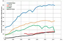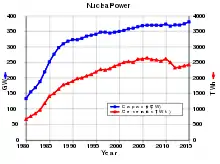 تولید سالانهٔ انرژی هستهای از سال ۲۰۰۷ به بعد، در سراشیبی نسبتاً ملایمی قرار گرفتهاست، بهطوریکه در سال ۲۰۰۹، ۱٫۸ درصد کاهش یافت و به ۲۵۵۸ تریلیون وات ساعت رسید که قادر بود ۱۳–۱۴ درصد تقاضای الکتریسیتهٔ جهان را تأمین کند. یکی از عوامل اصلی کاهش میزان انرژی هستهای پس از ۲۰۰۷، تعطیلی طولانی مدت رآکتورهای موجود در نیروگاه هستهای کاشیوازاکی کاریوا در اثر زمینلرزه دورکران چووتسو بود.