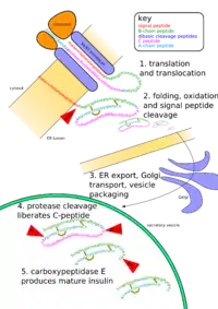 C-پپتید در پرو-انسولین، گستردگی بیشتری در میان جانداران دارد، انسولین پلیپپتیدی است که از دو زنجیره پپتیدی A و B تشکیل یافتهاست. تعداد اسیدهای آمینه در زنجیرهها که در زنجیره A برابر ۲۱ و در زنجیره B برابر ۳۰ میباشد، در انسولینهای جدا شده از اغلب گونههای حیوانی ثابت است. این دو زنجیره به کمک دو پل دیسولفور، یکی بین اسیدهای آمینه شماره ۷ از دو زنجیره و دیگری میان اسیدهای آمینه شماره ۲۰ از زنجیره A و شماره ۱۹ از زنجیره B با یکدیگر اتصال دارند. علاوه بر این، ریشههای اسید آمینه ردیف ۶ و ۱۱ در داخل زنجیره A به وسیلهٔ پیوند دیسولفور به یکدیگر متصل هستند. مکان این پیوندها در گونههای مختلف، ثابت است.