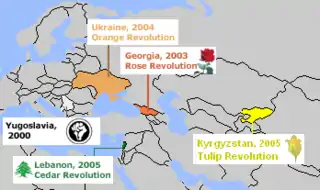 - انقلاب گل لاله، انتخابات پارلمانی ۲۷ فوریه ۲۰۰۵ (میلادی) در قرقیزستان پس از تعطیلی برخی روزنامهها و ایستگاههای رادیویی مخالفین انجام گرفت که در جریان آن حامیان عسگر آقایف به پیروزی چشمگیر و قاطعی دست یافتند، در پایان دور دوم رایگیری در ۱۳ مارس سازمان امنیت و همکاری اروپا روند انتخابات را با نقایص فراوان توصیف کرد در حالی که سازمان دولتهای همسود (نزدیک به روسیه) رایگیری را آزادانه خواند.[8] نخستین اعتراضات به روند برگزاری انتخابات از شهرهای جنوبی کشور آغاز شد، ۲۱ مارس ۲۰۰۵ آقایف تحت فشار افکار عمومی دستور بررسی تخلفات احتمالی را صادر کرد و در روز ۲۴ مارس در جریان نخستین راهپیمایی بزرگ مردمی در بیشکک (پایتخت)، دولت با حمله مردم به ساختمان اصلیاش سرنگون شد و آقایف به همراه خانوادهاش با یک بالگرد به قزاقستان و سپس به روسیه گریختند و انقلاب گل لاله که به واسطه وقوعاش در فصل بهار این عنوان را بر خود داشت به پیروزی رسید.[8]