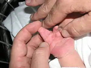 | Newborn baby hand showing complete complex syndactyly of two fingers. | |