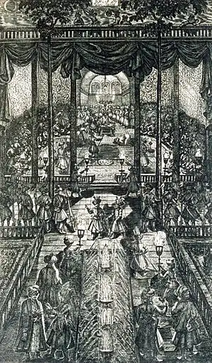 - فصل شانزدهم یا فصل پایانی کتاب به «پذیراییهای رسمی دربار» میپردازد. شرح ورود سفرا، اقامت و نحوه پذیرایی آنها از مسائل طرح شده در این فصل است.[18]