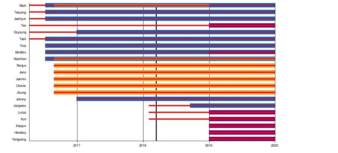 | تهیونگ | ۱ ژوئیهٔ ۱۹۹۵ | ۲۵ | ۱۵ آوریل ۲۰۱۶ | رهبر ۱۲۷ | ||||