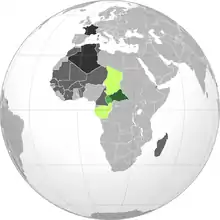 ![]() سبز: Ubangi-Shari (prior to 1916) سبز روشن: Ubangi-Shari (1916 concession from کامرون آلمان) سبز لیمویی: آفریقای استوایی فرانسه خاکستری تیره: سایر مستعمرات فرانسه خاکستری تیرهتر: جمهوری سوم فرانسه | |||||||