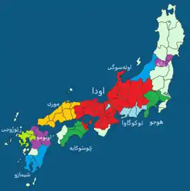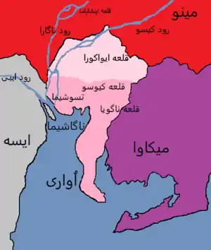 فیروزهای: توکوگاوا ایهیاسو (شامل سه ولایت از طرف از راست به چپ شامل سه ولایت سوروگا، توتومی و میکاوا)