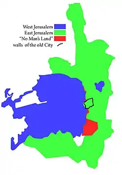 جنگ ۱۹۴۸ شهر را به دو نیم تقسیم کرده و بخش باستانی بطور کامل در سمت اردنی قرار گرفت. در نوامبر ۱۹۴۸، منطقهای حائل بین اورشلیم شرقی و غربی ایجاد شد: موشه دایان، فرماندهٔ نیروهای اسرائیلی در اورشلیم، با همتای اردنی خود عبدالله التل در خانهای متروک در محلهٔ مصراره دیدار کرده و قلمرو دو طرف را تعیین کردند. این تقسیمبندی تقریبی، پس از توافق صلح ۱۹۴۹ نهایی شده و بواسطهٔ آن شهر رسماً به دو نیم تبدیل شده و کوه اسکوپوس به عنوان منطقهٔ درون بومِ اسرائیل در اورشلیم شرقی تعیین شد.[141] دیوارههای بتنی و سیم خاردار در مرکز شهر، در نزدیکی دروازهٔ یافا در غرب بخش باستانی، کشیده شده و گذرگاهی در دروازهی ماندلباوم در شمال بخش باستانی در نظر گرفته شد. در خلال آن سالها درگیریهای نظامی متعددی توافق آتشبس را در شهر تهدید کرد.