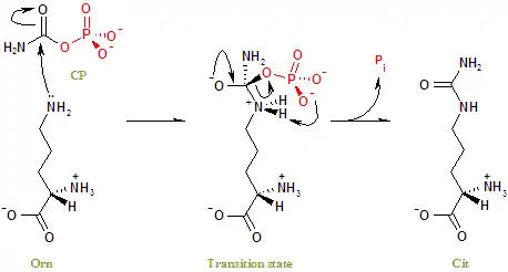 The side-chain amino group of Orn attacks the carbonyl carbon of CP nucleophilically, left, to form a tetrahedral transition state, middle. Charge rearrangement releases Cit and Pi, right
