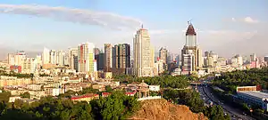![]() From top: A panoramic view of Ürümqi's ناحیه تجاری مرکزی، Red Mountain (Hong Shan), Ürümqi Night Market, and a view of تیان شان from Ürümqi | |
