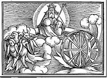 رویای حزقیال در کتاب مقدس زوریخ، اوفانیم به صورت چرخها در سمت راست و چروبیم به صورت موجودات چهار صورت در سمت چپ هستند.