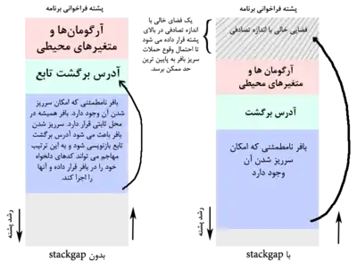 در اوپنبیاسدی، یک فضای خالی (گپ[و 7]) با اندازهٔ تصادفی در بالای پشتهٔ برنامه گذاشته میشود تا انجام حملات تخریب پشته سختتر شود. همچنین یک مقدار تصادفی به نام مقدار قناری[و 8][پ 3] در بین قابهای[و 9] پشته گذاشته میشود. پیش از اینکه تابع برگردد،[پ 4] این مقدار قناری بررسی میشود. اگر تغییر نکرده بود، سرریز رخ نداده است، وگرنه، سرریز رخ داده است.[27][38] این قابلیت در کامپایلر جیسیسی گنجانده شدهاست. مقدار قناری، که در هر بار فراخوانی شدن تابع به صورت تصادفی گزینش میشود، میتواند ۲۳۲ حالت گوناگون داشته باشد که احتمال اینکه مهاجم بتواند آن را حدس بزند بسیار بعید است.[39]