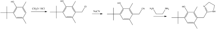 اوکسی متازولین طی کلرومتیلاسیون یک ترکیب به نام 6-tert-butyl-2,4-dimethylphenol و در ادامه، تغییرشکل مادهٔ کلرومتیلهٔ حاصله به نیتریل تولید میشود: