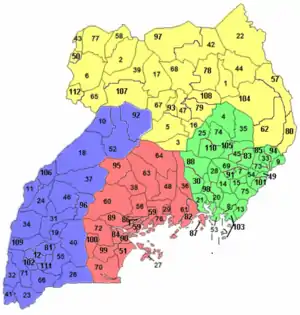 کشور اوگاندا به چهار استان تقسیم شدهاست. این استانها به نوبه خود به ۱۱۱ شهرستان به اضافه منطقه پایتختی تقسیم شدهاند.