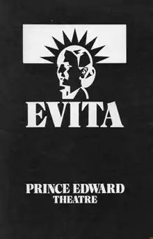 ![]() پوستر نمایشنامهٔ موزیکال اصلی اویتا در سالن نمایش پرنس ادوارد | |