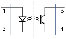 شماتیک یک اپتوکوپلر که فرستندۀ آن یک الایدی و گیرندهٔ آن یک فوتوترانزیستور است.