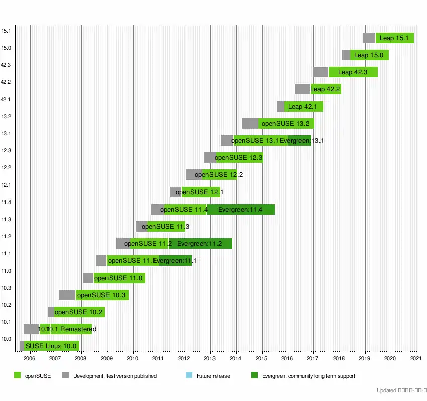 از سال ۲۰۰۹ تا ۲۰۱۴، هدف از راهاندازی پروژه openSUSE انتشار نسخه جدیدی از این برنامه در هر هشت ماه یکبار بود و قبل از راهاندازی نسخه های Leap از نسخه شماره ۱۱٫۲ و ۱۳٫۲ همراه با بهروزرسانیهای ضروری آنها استفاده میشد. برنامهای که مدت پشتیبانی از آن به طرز غیرقابلانتظاری ۱۸ ماه بود و با شروع به کار نسخه Leap 42.1 (پس از نسخه شماره ۱۳٫۲) هر وقت که یک نرمافزار اصلی منتشر میشد، مدتزمان پشتیبانی از آن حداقل ۳۶ ماه تعیین و آنهم تا زمانی که نسخه اصلی دیگر جهت انتظار آماده میشد (برای مثال نسخه شماره ۴۲٫۱–۱۵٫۰). انتظار میرود که زمان انتشار نسخههای اصلی هرساله باشد، آنهمزمانی که نسخه سرویس پک SUSE Linux Enterpriseنیز منتشر شود و کاربران نیز میتواند ظرف ۶ ماه آخرین بهروزرسانیها را انجام دهند. نسخه Tumbleweed بر یک مبنای غلتان بهروزرسانی میشود و فراتر از زمان نصب عادی بهروزرسانیهای کوچ نیاز به هیچ نوع بهروزرسانی دیگری ندارد.