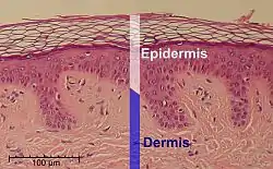 ![]() Histologic image of epidermis, delimited by white bar. | |