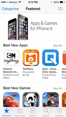 ![]() تصویری از محیط اپ استور در آیفون ۵سی اجرا شده در سیستم عامل آی او اس ۸ | |