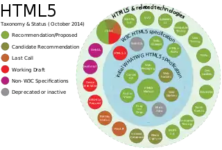 همه فناوریهای بالا در مشخصات W3C برای HTML5 شامل نشدهاست، ولی آنها در مشخصات WHATWG برای HTML وجود دارد. برخی فناوریهای مرتبط، که نه در مشخصات W3Cو نه در WHATWG برای HTML هستند، به شرح زیراند. W3C مشخصات اینها را جداگانه منتشر کردهاست: