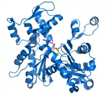 ![]() Ribbon diagram of G-actin. آدنوزین دیفسفات bound to actin's active site (multi color sticks near center of figure) as well as a complexed calcium dication (green sphere) are highlighted. | |||||||||