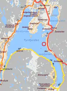 ![]() Detailed map of Tyrifjorden، with Utøya encircled in red | |