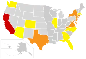 | کالیفرنیا، ایالت نیویورک، نیوجرسی،[6] تگزاس، نوادا، ماساچوست، فلوریدا، میشیگان، مریلند، ویرجینیا، واشینگتن، دی.سی.، ایلینوی[7] | |