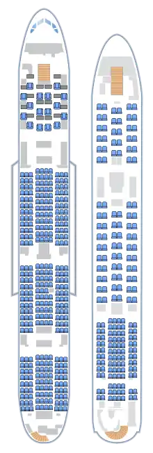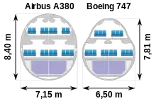 مقایسه ابعاد بوئینگ ۷۴۷ با ایرباس A380- ای۳۸۰–۸۰۰ دستکم ۵۵۵ نفر در سه کلاس یا ۸۴۰ نفر در یک کلاس.